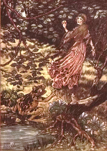 Pero de nada le sirvió desgañitarse y gritar ‘cro cro’ con todas sus fuerzas. La niña, sin atender a sus gritos, seguía corriendo hacia el palacio, y no tardó en olvidarse de la pobre rana, la cual no tuvo más remedio que volver a zambullirse en su charca.